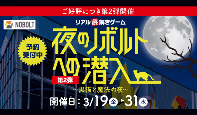 2021年3月19日(金)~3月31日(水)マリノアシティ福岡(福岡市西区小戸2-10-76)ノボルト(NOBOLT)では、リアル謎解きゲーム「夜のノボルトへの潜入第2弾~黒猫と魔法の夜~」を開催。